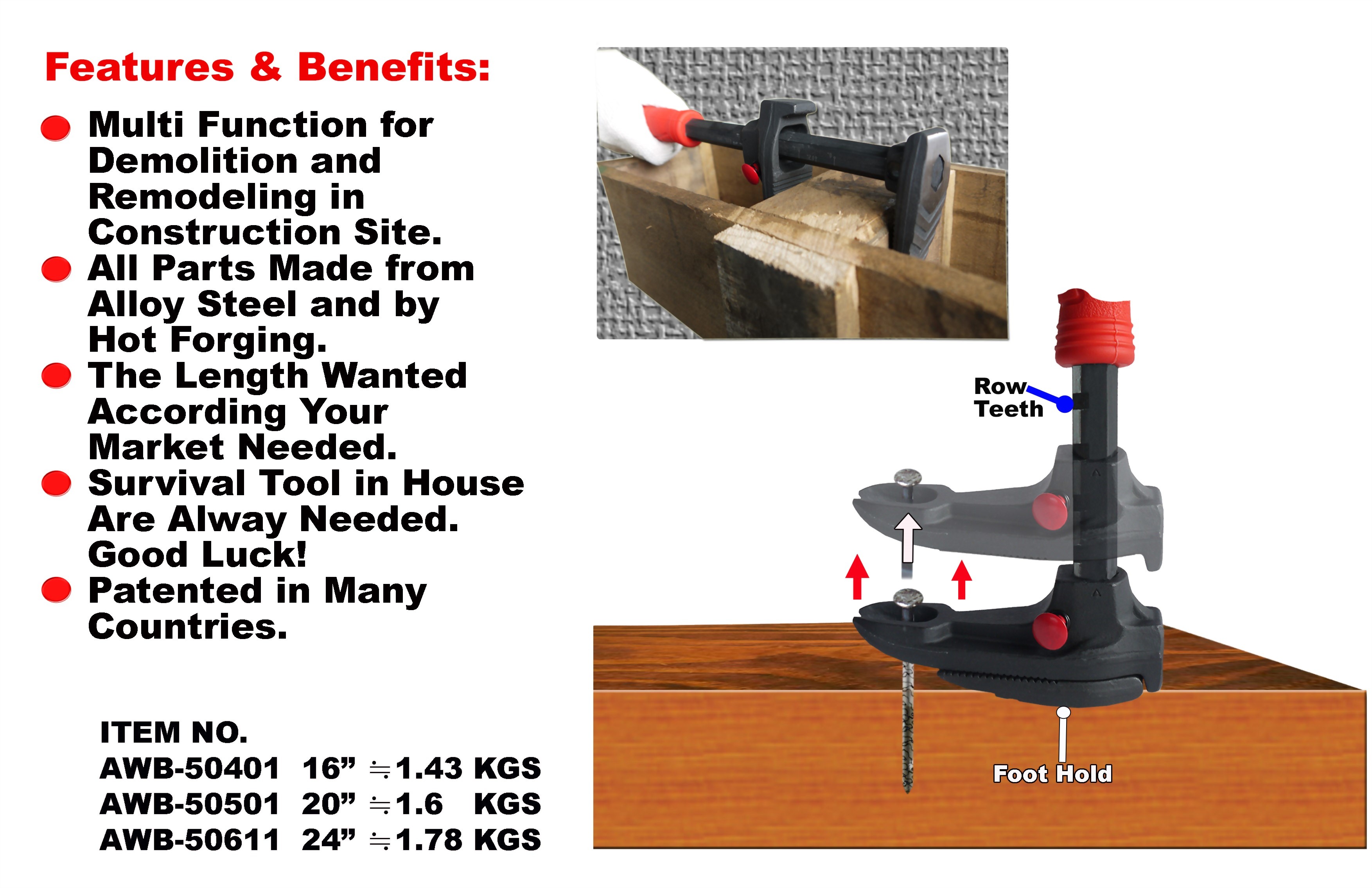 Home » Products » Demolition Wrecking Tools » AllGo Whole Bar AllGo Whole Bar Q'ty : Add To Inquiry awb-50401、50501、50611.jpg Description Related Products ALIGING HAMMER CROW BAR Wrecking Crow Bar Jumbo Size GEAR JAW WRECKING BAR GEAR JAW WRECKER POWER WRECKER (OVAL GRIP) GearJaw Extendable Rocking Pry Bar