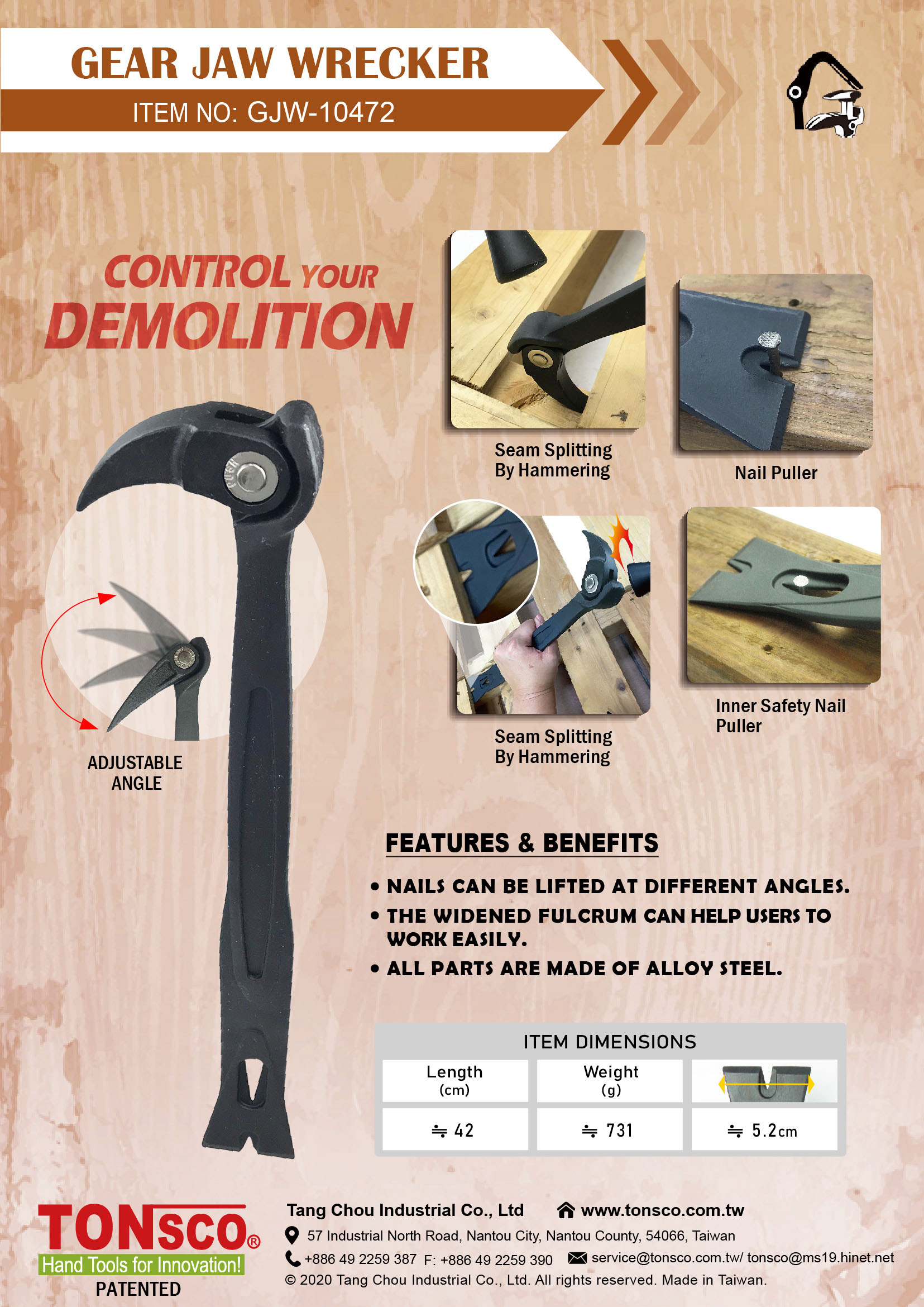 Home » Products » Demolition Wrecking Tools » GEAR JAW WRECKER GEAR JAW WRECKER Q'ty : Add To Inquiry gjw-10472-01.jpg Related Products GearJaw(R) Tweak Pry Bar Extendable Shank with Nail Puller Back Hook Building Pry Bar GearJaw Wrecker Nail Puller GearJaw Interior Decor Wrecker with Wrecking Nail Puller End GearJaw(R) Crow Bar Both End Extra Long GearJaw(R) Crow Bar Both End Extra Long