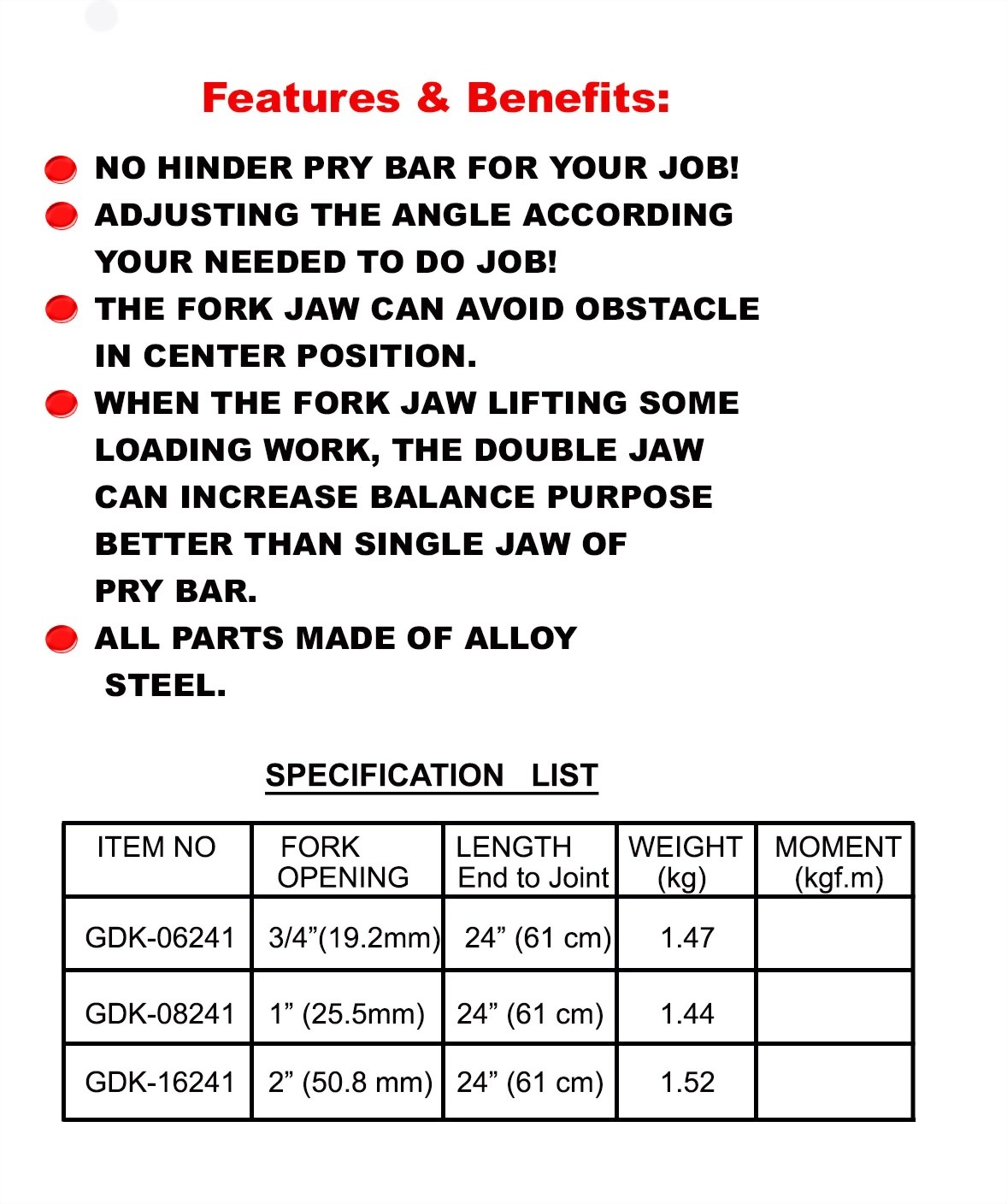 Home » Products » Demolition Wrecking Tools » GearJaw Interior Decor Wrecker with Wrecking Nail Puller End GearJaw Interior Decor Wrecker with Wrecking Nail Puller End Q'ty : Add To Inquiry gdk-06241、08241、16241.jpg Description Applications Related Products Extendable Free Long Wrecking Bar with Wrecking End GearJaw Extendable Rebar Bender with Round End TRIDENT WRECKER Deck Wrecker with trident nail puller (inner/ outer) PRY TWEAKING BAR-Flat Turn Hook Nail Puller
