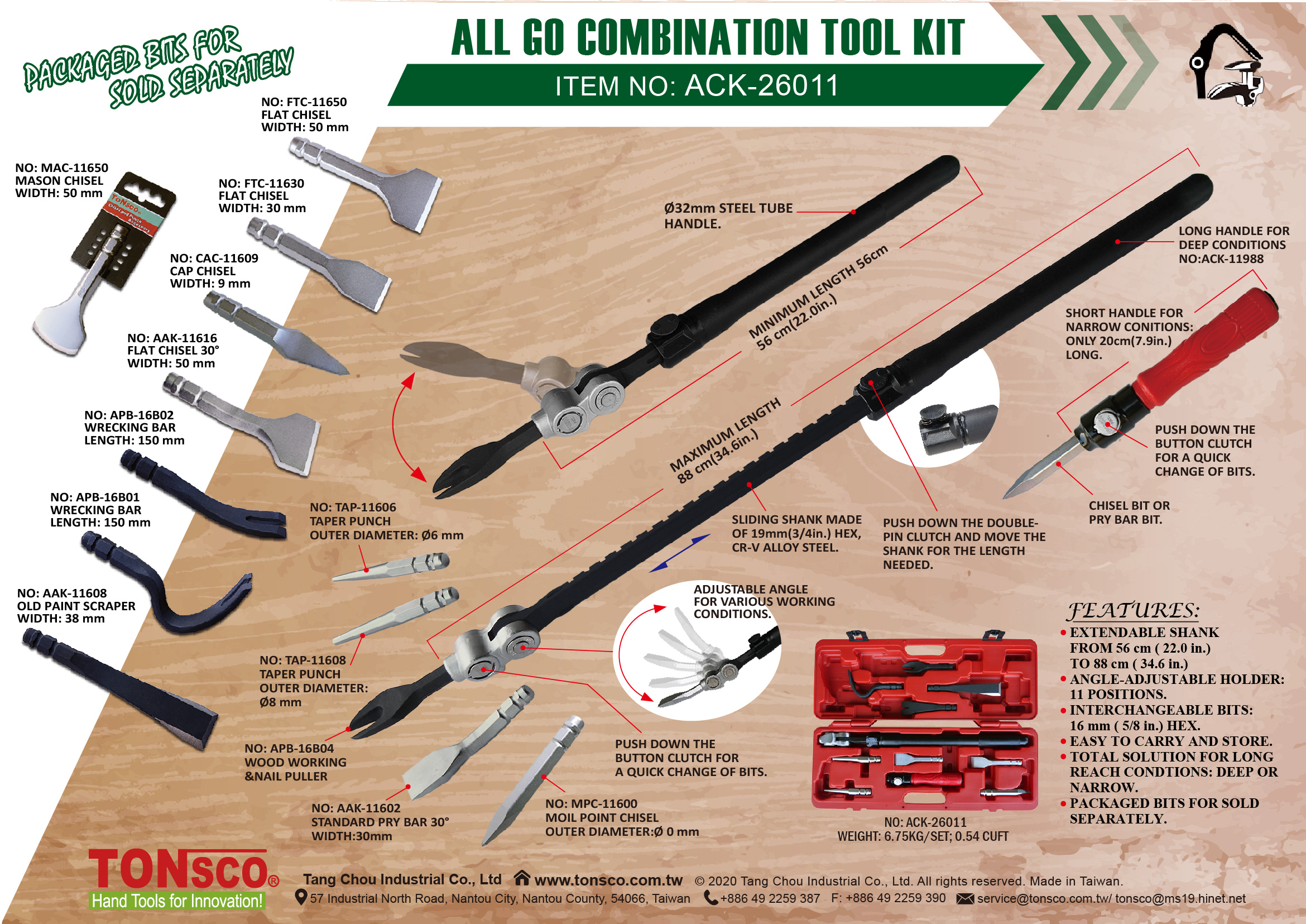 AllGo Combination Tool Kit for Home Improvement, Building and Construction. Exendable shank from 56cm (22") to 88cm (34.6"). Angle adjustable holder for 11 positions. Interchangeable bits: 15mm (5/8") Hex. Easy to carry and store. Total solution for long reach conditions.
